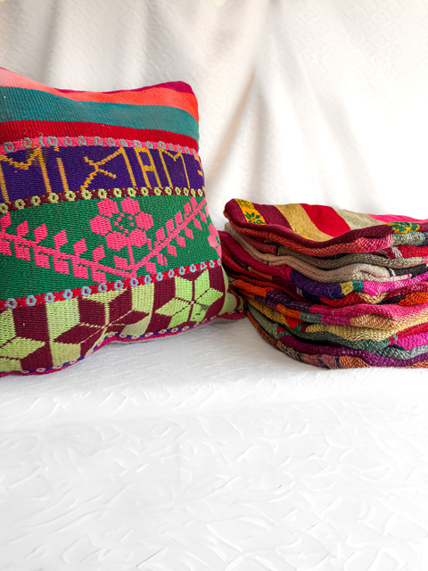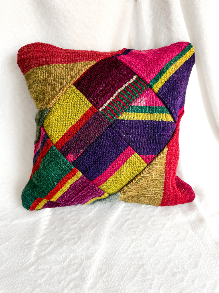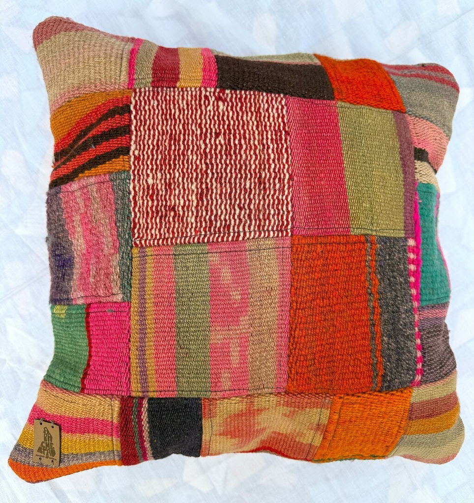 Funda de almohadón artesanal hecha con fragmentos de textiles recuperados, tejida con técnicas tradicionales y una paleta intensa de colores.