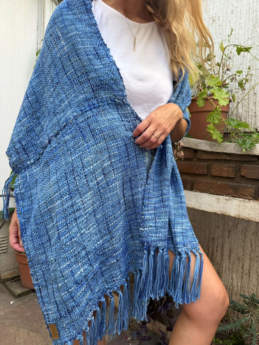 Sumá calidez y estilo a tu día con este chal tejido en telar, creado con hilos suaves en tonos azulados que aportan textura y movimiento.